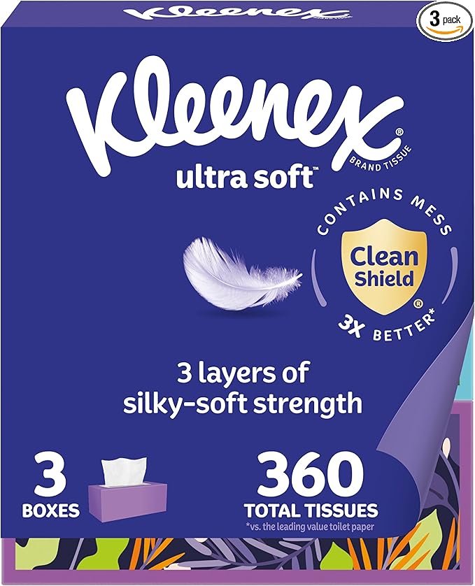 Kleenex Ultra Soft Facial Tissues, 3 Flat Boxes, 120 Tissues per Box, 3-Ply (360 Total), Packaging May Vary